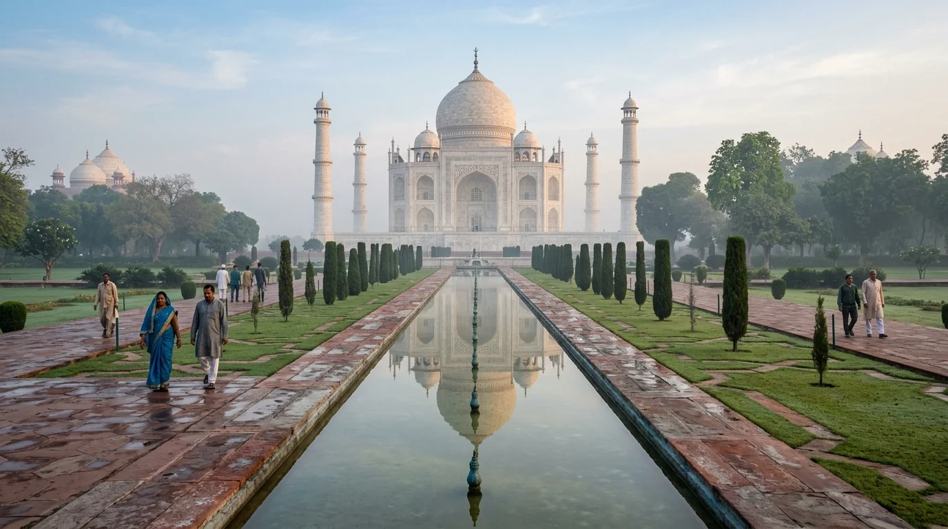 Na arquitetura, a lógica é semelhante. O Taj Mahal, segundo a UNESCO, é um edifício de simetria perfeita, organizado em torno de um eixo central, com mármore branco, arenito vermelho e incrustações de pedras preciosas. O charbagh diante dele, dividido em quatro quadrantes por canais de água, traduz em paisagem uma ideia de ordem maior. Não se trata de enfeite. Trata-se de visão de mundo convertida em forma construída.